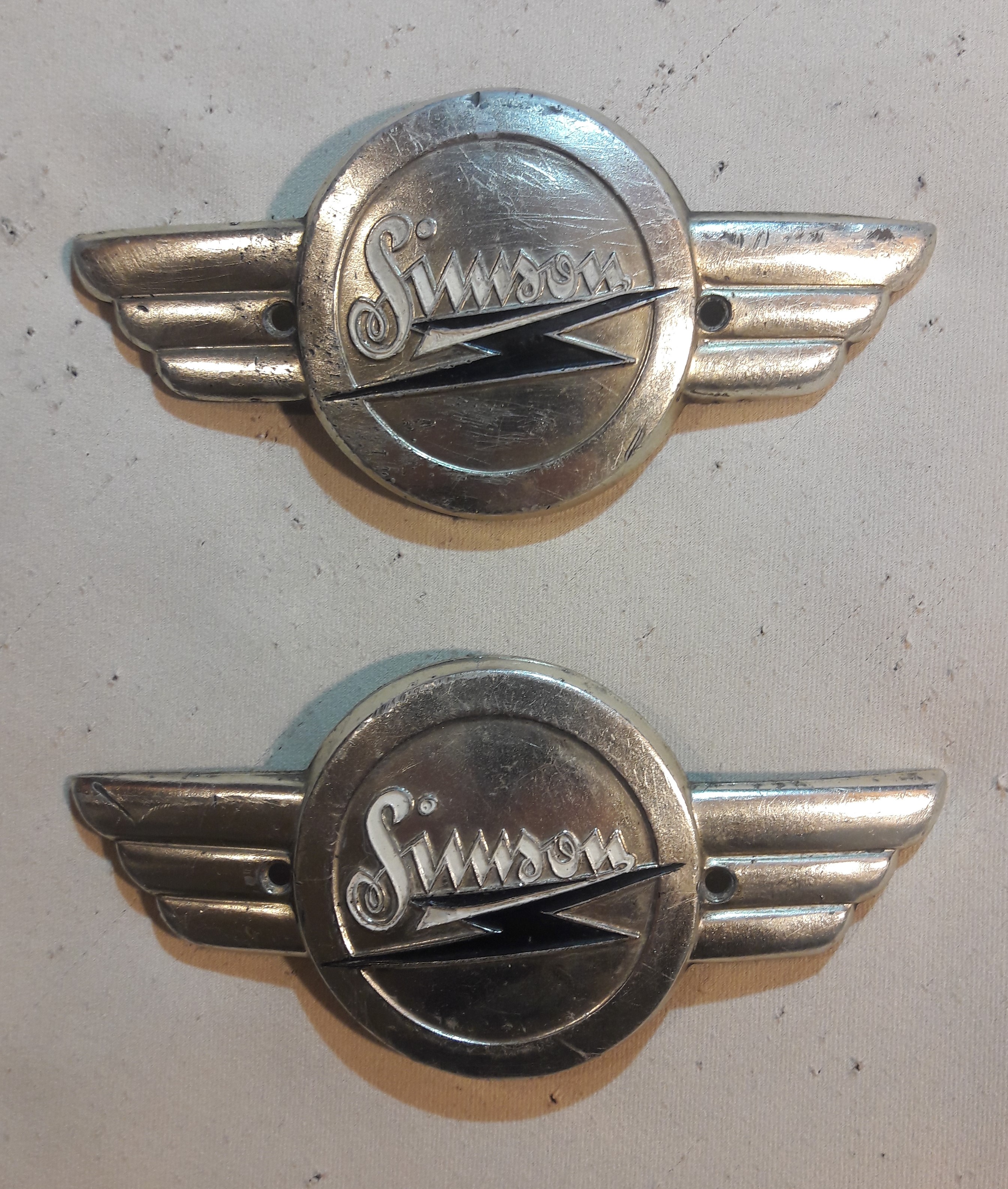 DDR Embleme Simson AWO Tankzwei originale Simson Flügel im Set, zur Verwendung als Embleme (Plaketten) für AWO Tank, DDR Originalersatzteil, mit Gebrauchsspuren jeweils ein Emblem mit der Kennung R für rechts und L für links passend für AWO Sport und AWO Touren Auf Lager 29,90 € / Set(s)